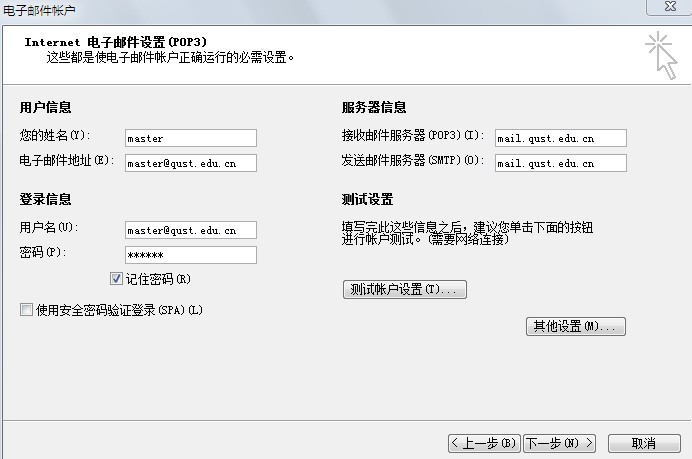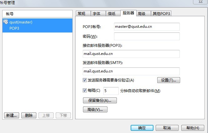 foxmail用户,点击菜单中的“工具”->“账号管理”,保证“Email地址”、“Pop3账号”为包括@qust.edu.cn的邮件地址全名,如下图所示